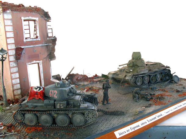 Т-34 от Dragon + травление Aber. Пушка Звезды + травление АСЕ. Фигурки фирмы Танк, дом и брусчатка от Миниарт (в доме доработал пол-потолок и остатки обоев на 2-м этаже), кирпичи россыпью от фирмы DAS Model.